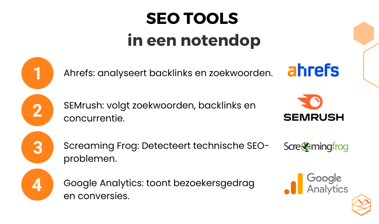 SEO-tools zijn essentieel om inzicht te krijgen in de prestaties en optimalisatiemogelijkheden van je website. Gebruik Ahrefs of SEMrush om backlinks en zoekwoorden te analyseren, Screaming Frog voor het opsporen van technische SEO-problemen, en Google Analytics voor waardevolle informatie over het gedrag van bezoekers. Door deze tools strategisch in te zetten, kun je gerichte verbeteringen doorvoeren en je website hoger laten scoren in Google.