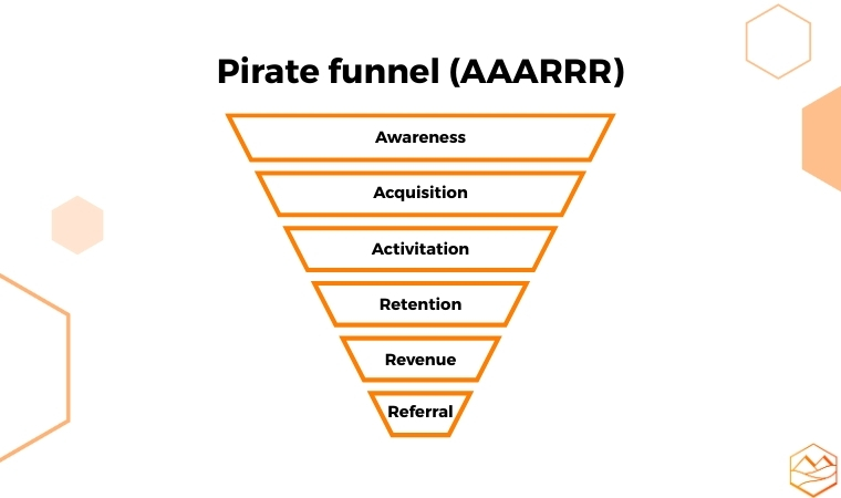 Bij de Pirate funnel ga je kijken naar de “AAARRR”, dat staat voor Awareness (bekendheid), Acquisition (verwerven van klanten), Activation (activering van gebruikers), Revenue (omzet of opbrengsten), Retention (behouden van klanten) en Referral (aanbevelingen of doorverwijzingen). In de afbeelding hieronder staat uitgelegd hoe je deze woorden het beste kunt zien en toepassen. Je werkt de trechter van boven naar beneden af.